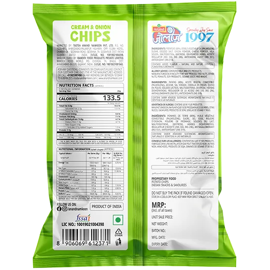 Potatoes (88%), Edible Vegetable Oil (Palmolein), Sugar, Iodized Salt, Onion Powder, Cheese Powder, Milk Solids, Maltodextrin, Dextrose, Dehydrated Herbs, Acidity Regulator (INS 330, INS 296), Anticaking Agent (INS 551), Antioxidant (INS 319).