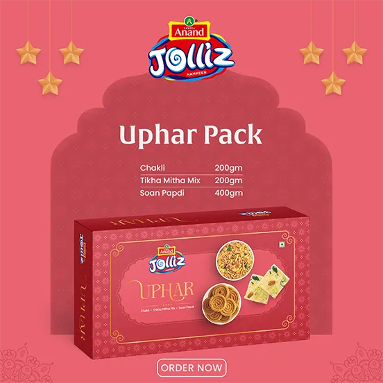 Share the joy with the Uphar Pack – a delightful treat of crispy Chakli, flavorful Tikha Mitha Mix, and melt-in-mouth Soan Papdi, perfect for gifting!